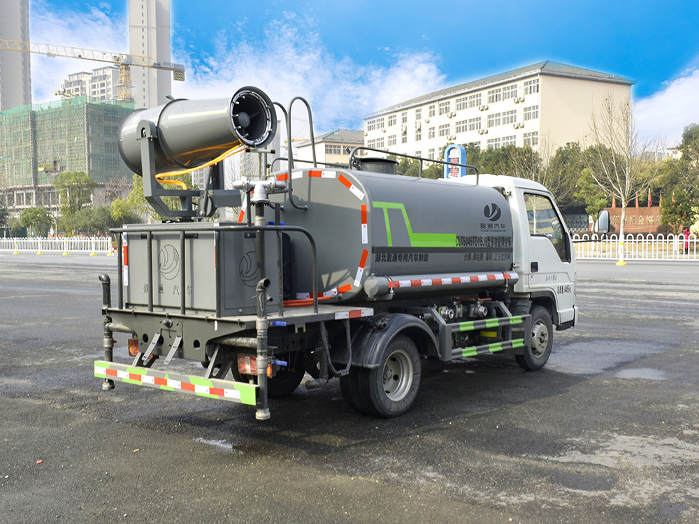 3方霧炮灑水車 整車型號 CLT5045TDYBJ6 型多功能抑塵車 2 發動機型號 Q23-95C60 3 發動機馬力/功率 全柴 95 馬力/70KW 4 發動機排量 2300ML 5 變速箱 蒙沃 5 檔箱 6 輪胎規格 6.00 鋼絲胎 7 軸距 2600 8 總質量 4495KG 9 整備質量 2700KG 10 額定載質量 1665KG 11 整車尺寸(長×寬×高) 5.365*1.9*2.6 12 罐體容積 2.7 方 13 燃料種類 柴油 14 排放標準 國六 15 水泵型號 40/50 16 罐體材質 Q235 碳鋼產品功能展示 霧炮 后灑 后對沖 高炮 側噴