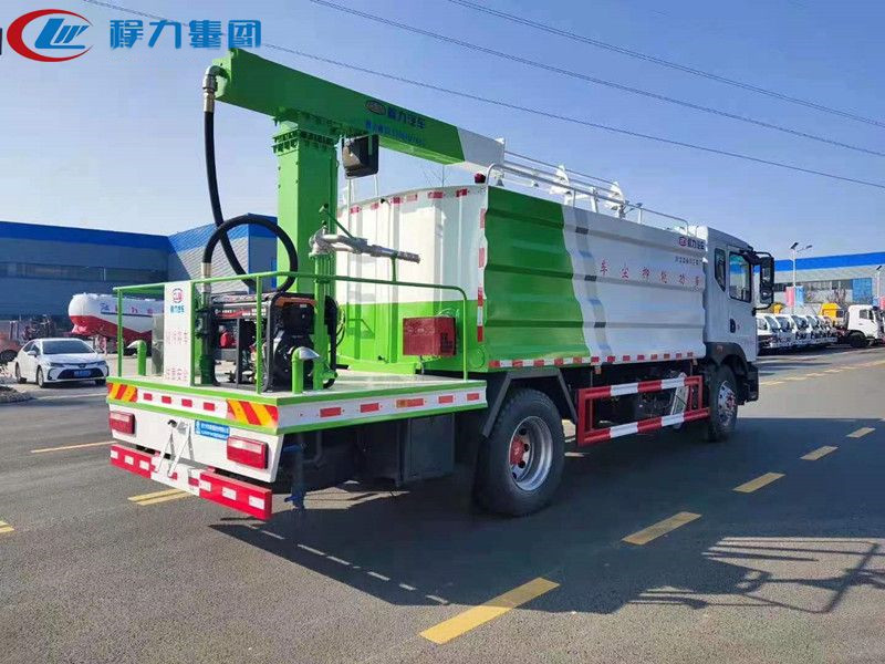 上裝配置:罐體采用瓦楞方箱制作,材質Q235,邊4底5,容積:12-15方,標配大功率50/110水泵,萬達液壓回轉機構,帶自動回流,整車氣動控制,駕駛室操作,箱頂2個1.5千瓦電機,科普8千瓦發電機組,3個攝像頭(流量表,噴灑桿,整車尾部),駕駛室12寸彩色視頻可回放,液壓控制裝置,并配有液壓防沉淀攪拌裝置,電子流量計,渦流噴射帶噴頭,也可選裝螺旋式不銹鋼噴頭,氣動控制噴頭(一組控制4個噴頭),噴灑高度4.3米-5.2米,勾檔停車可感應3米,自動停噴,8個噴嘴,葉片式絞龍機構,可選裝灑水車功能(前部沖洗路面噴灑裝置,兩側面噴灑裝置,帶后部工作平臺、平臺上安裝綠化灑水炮(炮噴射形狀可調),可調直沖狀、大雨、中雨、毛毛雨,可連續調節,射程可達28米,垂直吸程≤7米),帶消防接口、自流閥,可自吸自排。)、加裝氣控回流裝置