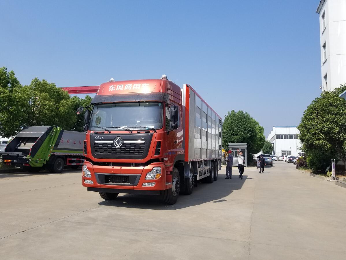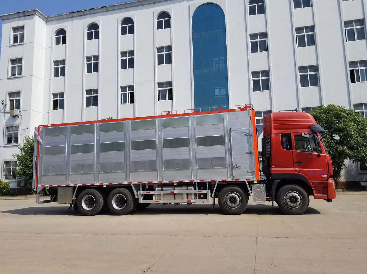 東風天龍前四后八全鋁合金運輸車,又稱鋁合金禽畜運輸車,可做三層或四層,品質更佳,車身結構采用鋁合金打造,不銹鋼噴頭和飲水頭,相比鋼制車體,重量減輕20%-30%,可以裝載更多的畜禽,空車行駛節約燃料,低維保費用,不生銹,生命周期無線延長,無需漆面保護,清潔簡單便捷,操作簡易,車廂升降平臺由全液壓控制,遙控操作更加簡便,自動恒溫系統,車廂設計合理方便控制家禽上下車,遙控升降車,動物福利,更大的 內部空間,家禽在車廂內更感舒適,溫度控制系統,沖淋飲水系統,遙控側面通風系統,可開合側窗系統,強制通風系統。