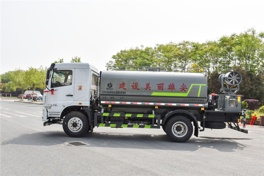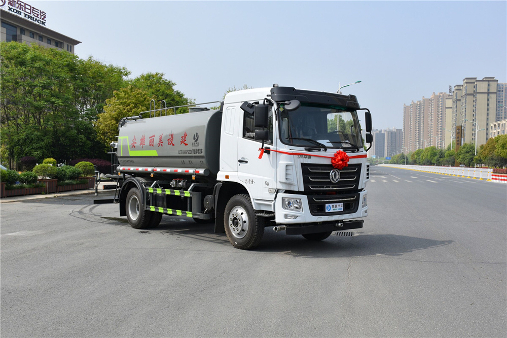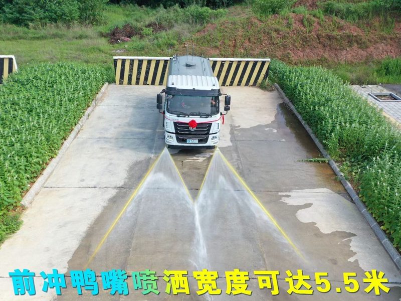 灑水車專用功能配置:罐體實際容積約為12立方米,(罐體有效參數9.79立方米、額定載質量9325kg、)采用武鋼優質碳鋼板卷壓成型。配備專用灑水泵,自吸自排,前噴后灑、側噴、后工作平臺及灑水高壓炮。灑水泵自吸高度為6米左右,整車灑水寬度14米左右,后工作平臺水炮可調成:直沖狀、大雨、中雨、小雨、毛毛雨,有效射程≥28米,整車帶接頭、水位計,自流閥。后工作平臺主管路帶1寸澆花接口,附送2根3米水管,1個爬梯,兩側及后保險杠。