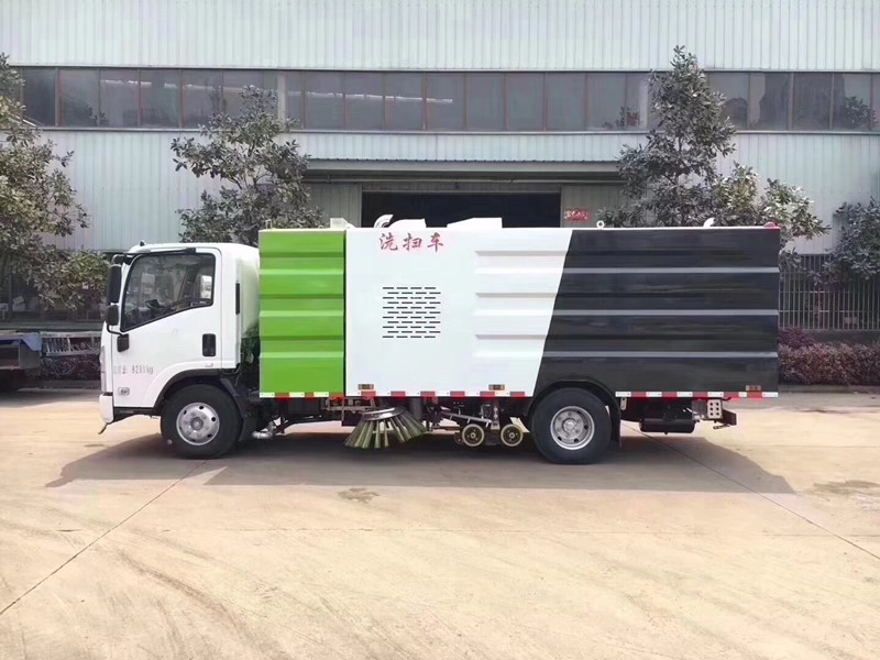 五十鈴洗掃車配置中置兩掃刷盤,中置寬吸盤、高壓噴水桿,在作業過程中可完成垃圾及污水的一次性回收,車輛具有道路清掃、清洗,路邊石洗掃、路面灑水 及噴霧抑塵,高壓水槍清洗等多種功能。