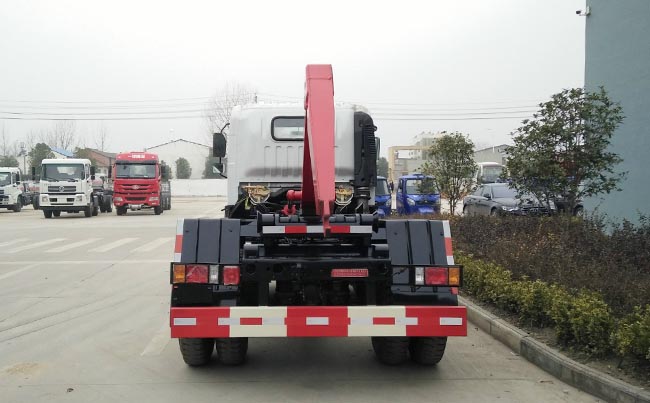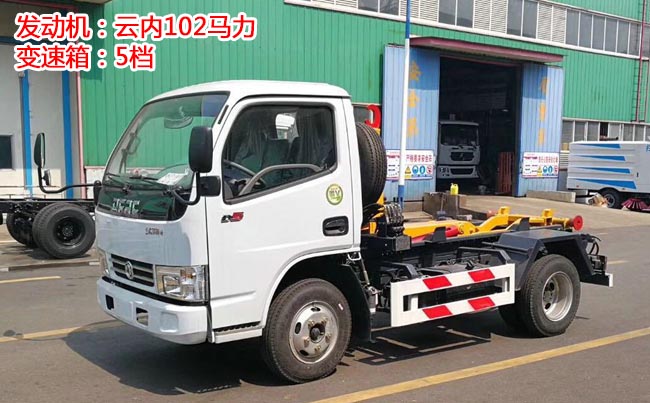 配套5~6立方米勾臂垃圾箱,高強度主勾臂,雙液壓油缸,采用國產(chǎn)油泵、多路閥、油缸,駕駛室外操作,尾部帶滾輪,箱體鎖緊裝置,鎖緊后可實現(xiàn)垃圾車自卸。