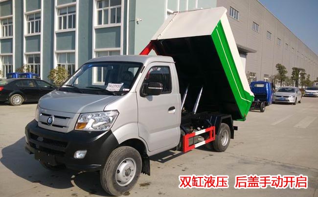 箱體容積3~4立方米,板材厚度邊3底4,箱體結構為墻板形式,國產多路閥,油泵、取力器、油缸,駕駛室外部操作、箱體底部雙缸液壓舉升卸料,后門機械鎖緊、手動開啟。