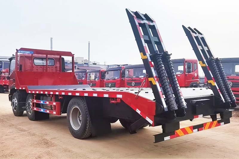 福田前四后四平板拖車,國六排放標準,采用新款瑞沃ES5駕駛室,標配中控鎖電動門窗、原廠空調、氣囊座椅、定速巡航、ABS等,可定制液壓雙節折疊爬梯,爬梯長度4米以上,運輸叉車等機械設備