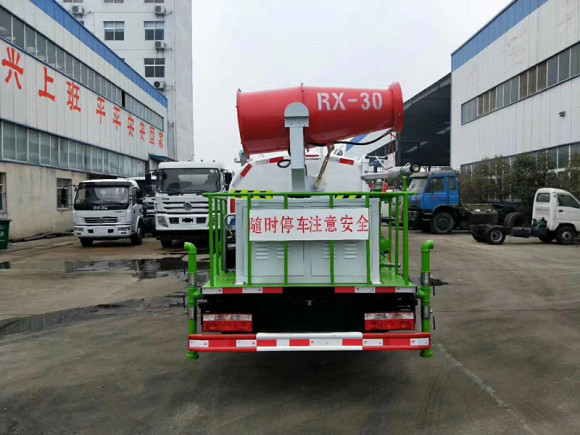 灑水車前沖(噴)、后灑、帶側噴(花灑)、帶后工作平臺、平臺上安裝綠化灑水高炮(炮噴射形狀可調節:直沖、大雨、中雨、毛毛雨、霧狀、可連續調節,360°旋轉),配消防接口,自流閥,濾網,帶自吸自排功能。