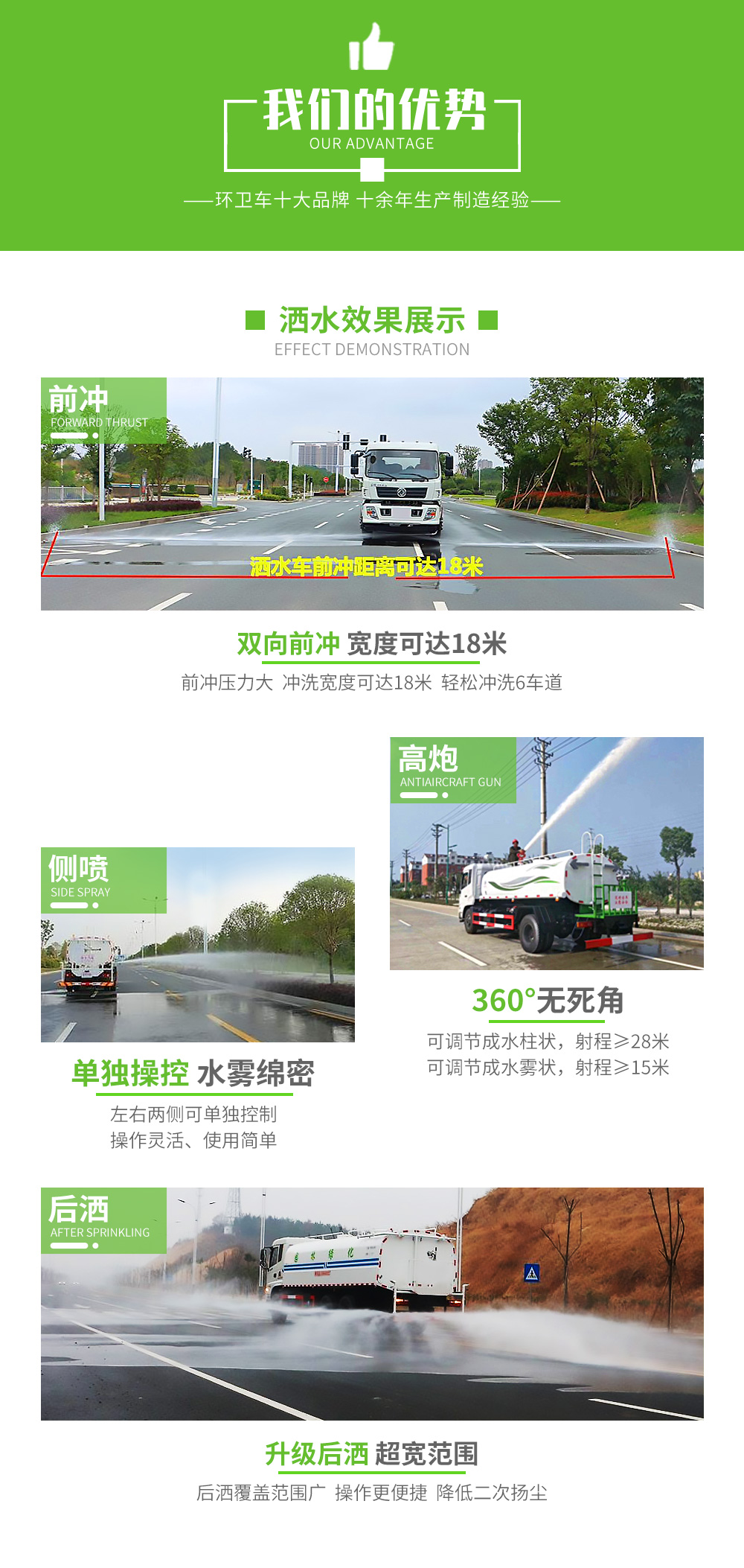用功能配置:罐體實際容積約為12--14--16立方米,采用武鋼優質碳鋼板卷壓成型,自動焊接。配備專用灑水泵,自吸自排,前噴后灑、側噴、后工作平臺及灑水高壓炮。灑水泵自吸高度為6米左右,整車灑水寬度14米左右,后工作平臺高壓水炮上下左右360°旋轉可調成:直沖狀、大雨、中雨、霧狀、有效射程≥28米,整車帶接頭、水位計,自流閥。后工作平臺主管路帶1寸澆花接口,附送2根3米水管,1個爬梯,兩側及后保險杠。