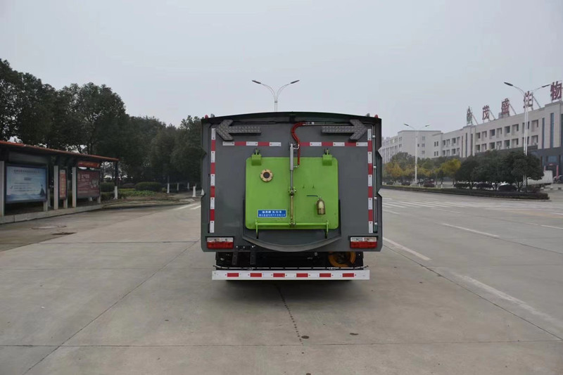 上裝配置:帶2個中置掃盤,意大利馬達;德國高壓水泵(前沖/側噴/中噴/后噴霧(不銹鋼噴嘴) /側沖洗水槍/垃圾箱自潔裝置) ; 萬向高壓路沿清洗,威龍低壓泵(前沖) ;不銹鋼垃圾箱;德國控制器;美國傳感器;尾部箭頭燈;機油、垃圾箱、水箱均帶防溢或低位報警裝置;倒車及洗掃狀態室內監視器;倒車自動保護裝置; 20米高壓沖洗卷盤。清掃寬度3 .5m,吸入粒度10mm;全PLC-鍵電腦控制。