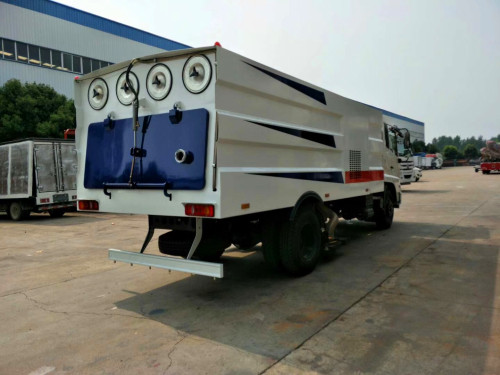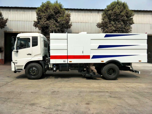 該掃路車采用東風天錦型國五二類底盤改裝,加裝副發動機、風機、清水箱、垃圾箱、左右立掃、后置吸盤,掃盤降塵系統,液壓系統、專用裝置電控系統和副車架等改裝而成(可加裝前沖后灑,可以根據客戶要求做成方形、圓形箱