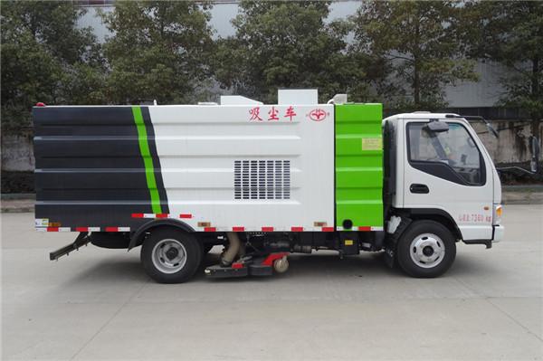 該吸塵車是采用江淮型國五二類原廠汽車底盤改裝,加裝副發(fā)動(dòng)機(jī)、風(fēng)機(jī)、清水箱、垃圾箱、中置吸盤,工作視頻探頭,自動(dòng)脈沖清理功能,液壓系統(tǒng)、專用裝置電控系統(tǒng)和副車架等改裝而成。