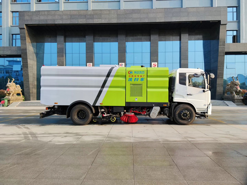 洗掃車具有路面清洗、路面清掃 路緣和路緣石立面洗刷、低壓沖洗、噴霧除塵等多功能。有“全洗掃”、 “左洗掃”、 “右洗掃”、 “全掃”、 多種作業模式可選擇。選擇“全洗掃”模式清洗廣場和路面,清洗效率高效果好,洗凈率達95%以上。選擇“左洗掃”或“右洗掃”模式清洗路面和路緣 。需要進行路面清掃或路面保潔作業時,可選擇掃路模式。需要噴霧除塵時,可開啟噴霧裝置,進行噴霧除塵作業。可以像灑水車一樣對路面進行低壓沖洗作業。