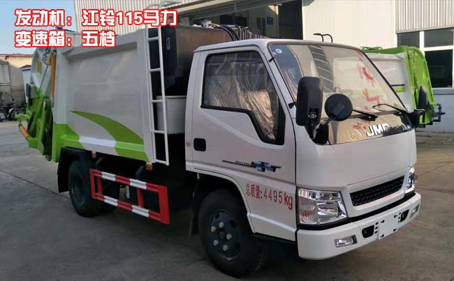 江鈴順達(dá)藍(lán)牌壓縮式垃圾車,江鈴順達(dá)原裝底盤,2800軸距,國五江鈴115馬力柴油電噴發(fā)動機(jī)(型號:JX493ZLQ5),五檔變速箱,方向助力,油剎,7.00R16鋼絲胎,ABS,空調(diào)。